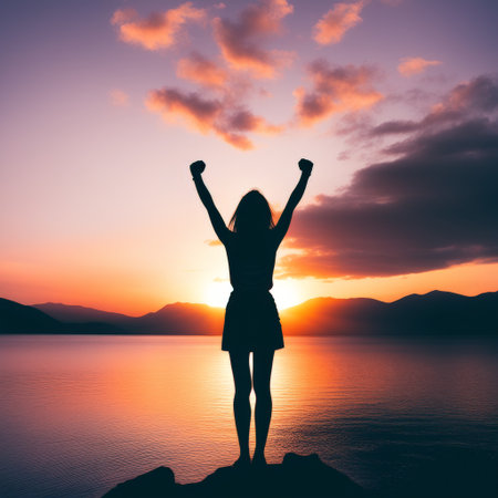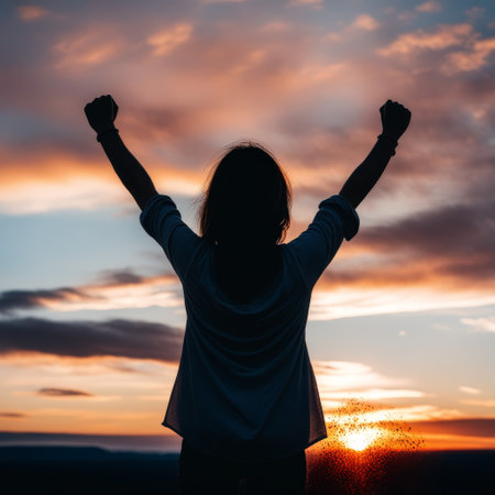A person in a hoodie raises their arms triumphantly against a glowing sunrise sky, embodying a motivational sports aesthetic. The vibrant colors create an inspiring atmosphere.
