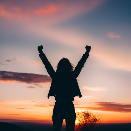 Person in silhouette stands victorious on mountain summit during colorful sunset