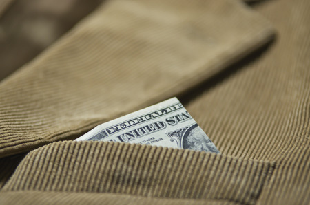 A wad of money in the pocket of a man's pants. dollars in your pocket.