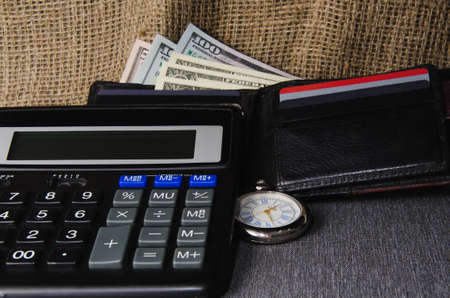 Calculator with leather wallet on black background. Family bujet, economical calculation, additional accounts of expenses. Top view