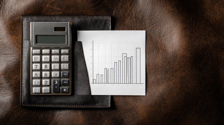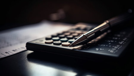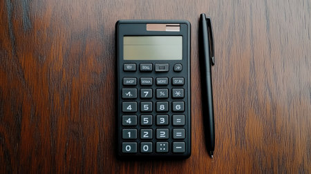 A top-down view of a financial report with a calculator and pen, leaving space for adding business finance tips, budget planning, or investment strategies