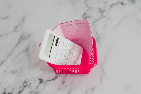 pink shopping basket on marble desk with magnifying glass and calculator, concept of analyzing your expenses and budgeting