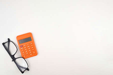 Selective focus image of bank note,calculator, and spectacles isolated on a white background with copy space
