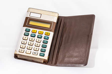 Old electronic pocket calculator in a brown plastic sleeve on white background.