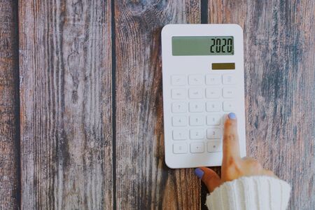 Budget planning for 2020 concept, woman hand on white calculator on wooden background, new year resolutions on financial