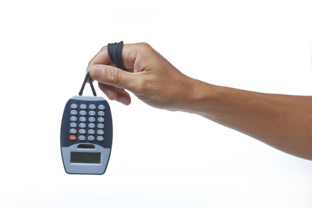 The keyboard of an old electronic organizer with liquid crystal display isolated on a white background. Obsolete technology of the 90s