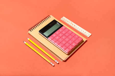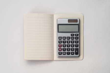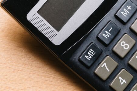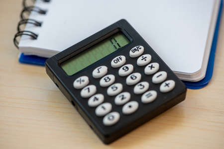 A calculator and a notebook on a wooden table with copy space. Selective focus.
