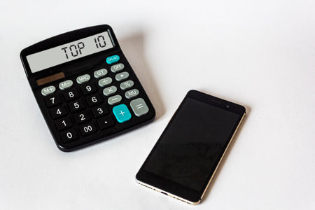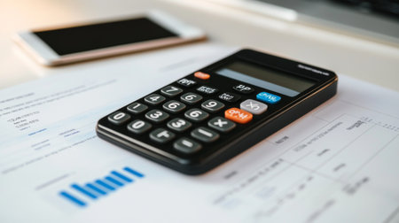 A close-up of a calculator resting on a financial report, with a smartphone beside it. Perfect for concepts related to finance, budgeting, and analysis.