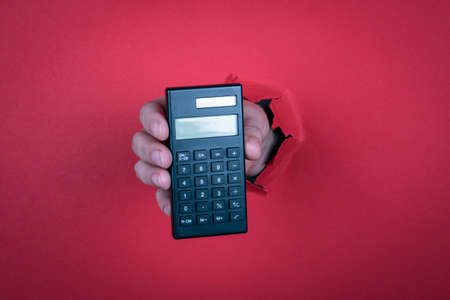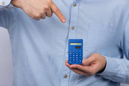 Man holding calculator and shows finger at him. Calculation of budget, savings, tax calculation.