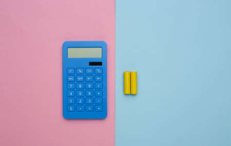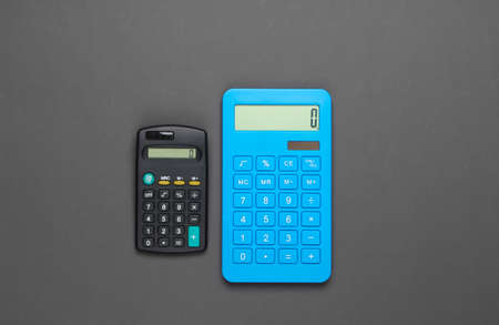 Two calculator on gray background. Calculation or counting. Minimalism. Top view