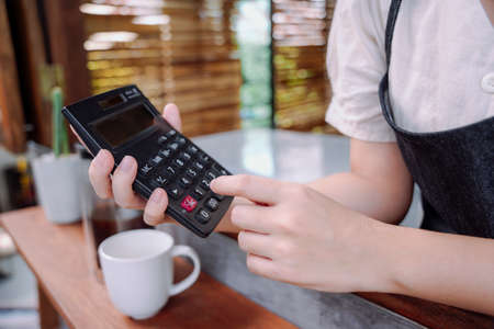 Coffee shop staff using calculator after customer call for a bill. Local business.