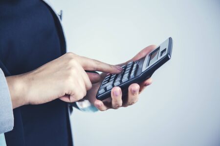 Man hand holding pen and calculator expense or tax receipt. business finance concept.