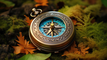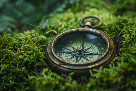 Antique compass nestled in vibrant moss, symbolizing guidance and nature exploration