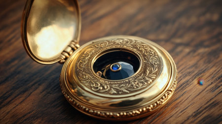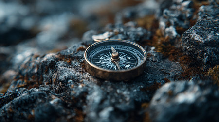 An old, brass compass rests on a weathered surface, its needle steady and pointing north.