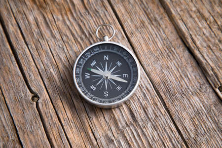 Magnetic compass on old brown wood. Vintage still life. Sailing accessories. Travel, navigation, collecting, souvenir, gift, graphic resources, copy space