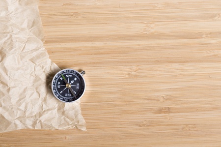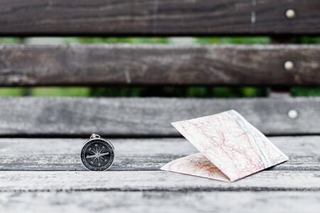 Vintage compass lying on the floor. Adventure and discovery concept.