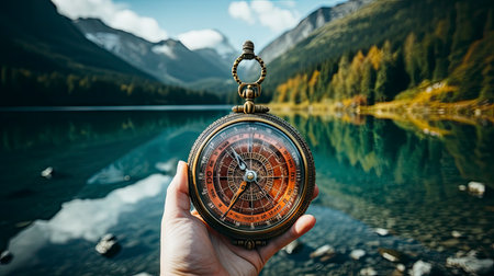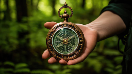 Explorer Holding a Compass in a Dense Forest, Navigational Tool for Outdoor Adventure, Close Up Shot in Nature AI Generative