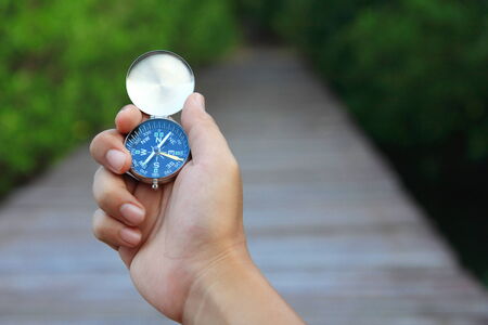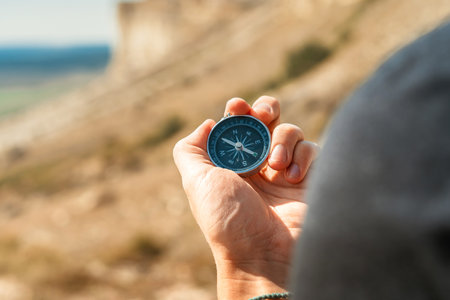 compass in the hand of a traveler, searching for yourself on the way, a concept.