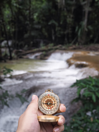 Close up of compass in woman hand with waterfall as background. The concept of world tourism day, Searching the right directions and Travel