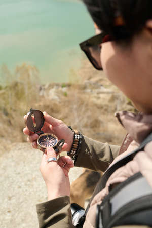 Unrecognizable modern female traveller hiking somewhere on spring day using compass to find direction