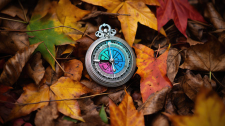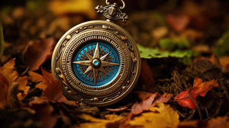 Compass in the autumn forest. Compass on the background of autumn leaves.