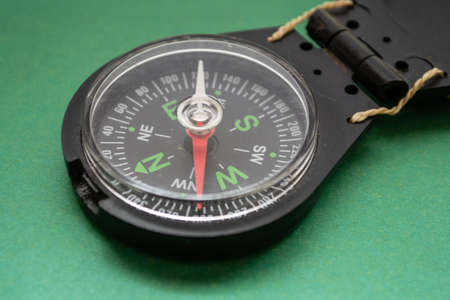 Compass on grass background. Travel concept.Compass with fresh green grass and copy space.