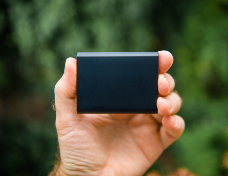Man hand holding Portable SSD 2 tb external hard drive disk with high read and write speed against green background unboxing testing