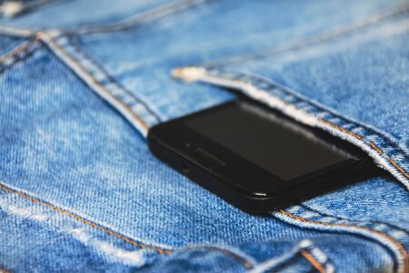 Black smart mobile phone in back blue jeans pocket denim background texture.