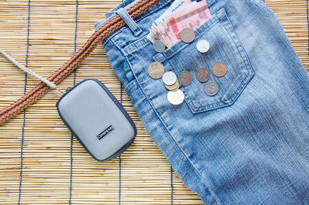 Closeup Passport, wallet, Jeans and Preparing for traveling