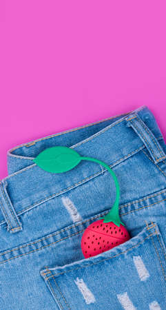 Blue ripped denim shorts on a pink background. In the pocket of the strawberries.
