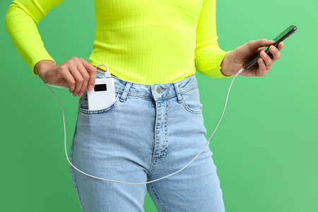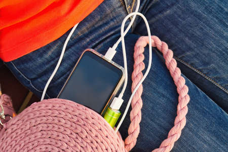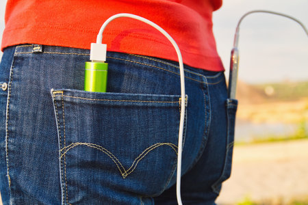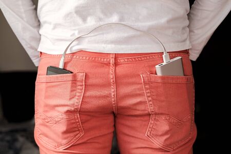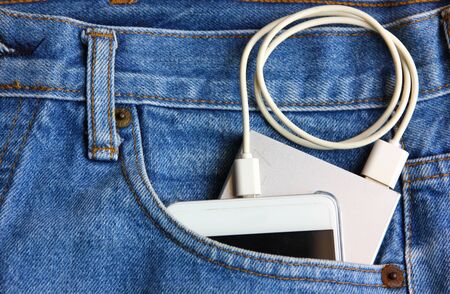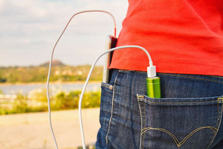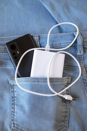 An external power bank and smartphone is in the jeans pocket. Charging your smartphone outdoors