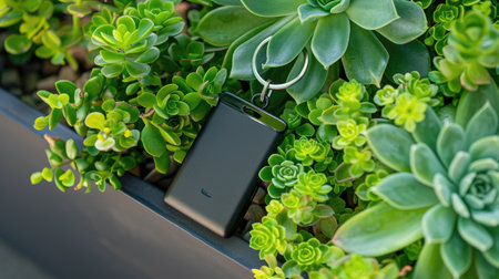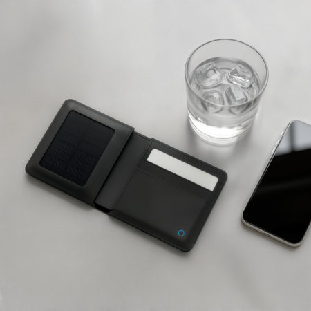Smart wallet with solar panel next to phone and glass of water. Space for text.