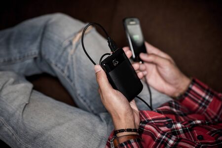 The man charging his smartphone with black power bank. Shallow depth of field focused on power bank display.
