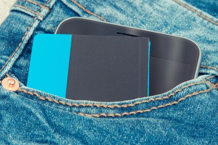 Credit card and mobile phone for cashless paying in pocket of blue jeans. Finance and banking concept