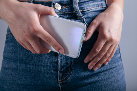 A young girl takes jeans out of her front pocket or puts a condom there. Close up, no face