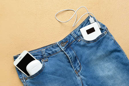 Modern power bank, mobile phone and case for earphones with jeans on beige background