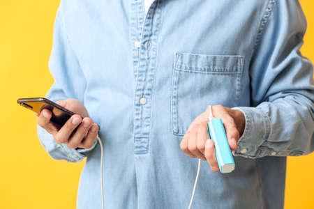 Young man with phone and power bank on color background, closeup