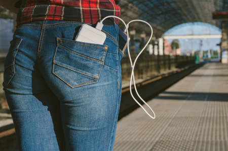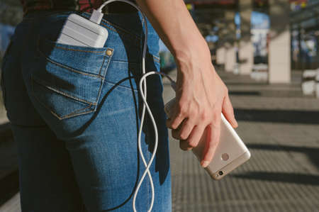 Power Bank in the girl's back pocket and a smartphone in her hand, against the background of the station