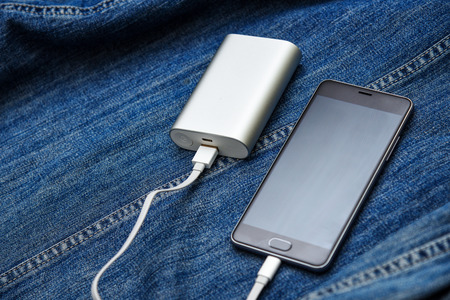 Smartphone battery charging with power bank. close-up at the grey power bank.