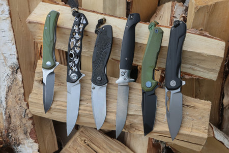 Different folding knives on birch wood close-up