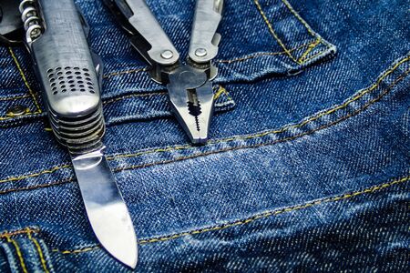 multifunctional tool kit consists of pliers and a folding knife lies on a dark blue background, the jeans material of work clothes