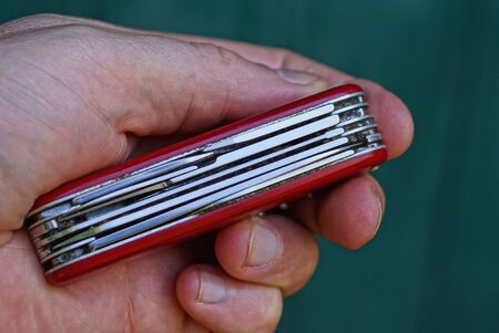 fingers hold a small folding army knife on a green background