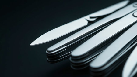 A detailed shot of the blades of a Swiss Army knife, all extended and ready for use.