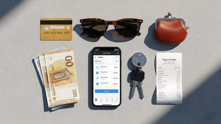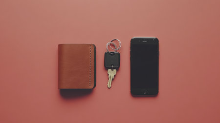 A stylish arrangement featuring a leather wallet, keys, and a smartphone against a vibrant pink background. Ideal for showcasing minimalist lifestyle concepts.