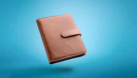 Leather notebook floating or flying isolated on light blue background