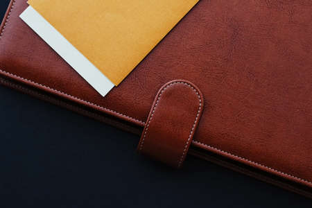 Office supplies on leather surface table