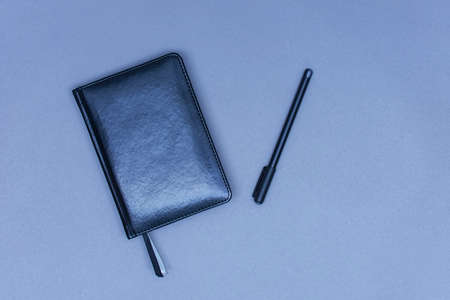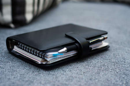 Notepad and stationery on a black background. Planner for business and study. Fans of stationery