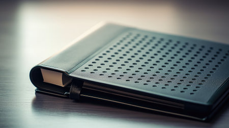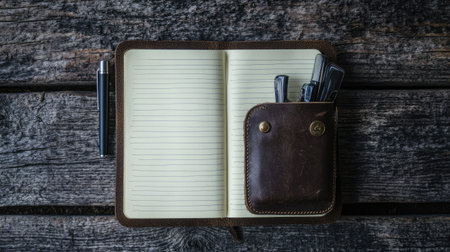 A closed black leather diary lies on a table with a pen for notes