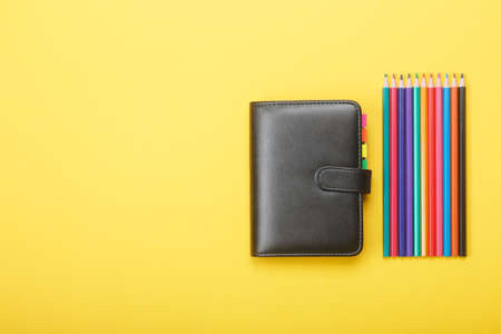Notebook and color pencils on a yellow background. Mock up with copy space for your ideas. Flat lay style.