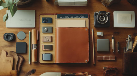 Discover an organized workspace with a leather binder, assorted stationery items, and a vintage camera, capturing creativity in a top-view arrangement.